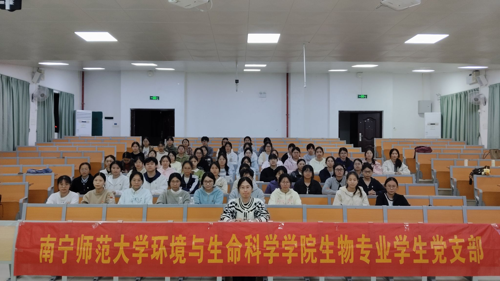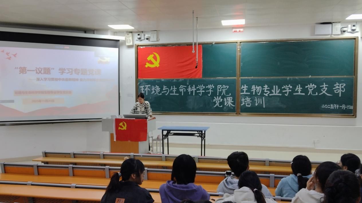 生物专业学生党支部于2025年11月25日晚在武鸣校区一号教学楼114教室开展11月份“第一议题”专题党课学习。会议由党支部书记刘雅楠主持,全体党员参加会议。