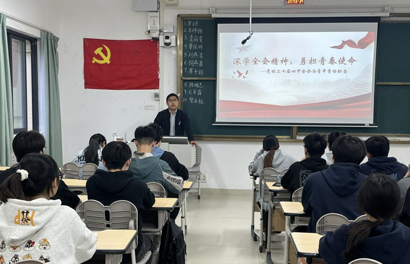 环工专业学生党支部在武鸣校区1号教学楼120教室组织开展学习“党的二十届四中全会精神”专题党课。本次学习由支部书记普胤杰同志主讲,支部全体党员参加学习。