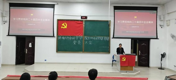 生物专业学生第二党支部在地海楼B109教室顺利开展“学习贯彻党的二十届四中全会精神”主题党课暨支部委员会选举大会。本次会议采取线上线下相结合的方式,由党支部书记刘雅楠主持,党支部全体党员参会。