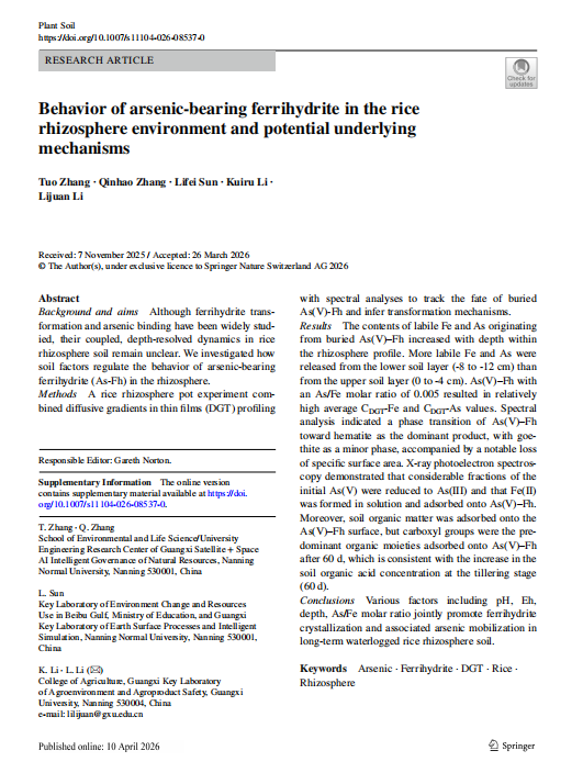 我校流域污染防治与生态保护重点实验室(团队)在国际农林科学/土壤学领域权威期刊《Plant and Soil》(JCR Q1,新锐分区2区TOP期刊,IF=4.1)发表了题为《Behavior of arsenic‑bearing ferrihydrite in the rice rhizosphere environment and potential underlying mechanisms》论文成果,重点实验室主任张拓副教授为论文第一作者,其指导的硕士研究生张钦豪为论文第二作者,南宁师范大学为论文的第一完成单位,该研究首次系统揭示了含砷水铁矿在水稻根际环境中的转化行为及其驱动机制,为南方稻田砷污染修复提供了重要的理论依据。
