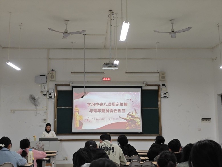 甘佩萍老师首先结合党史脉络,和参会党员共同梳理了中央八项规定的有关内容,强调该规定是必须遵守的政治纪律,并结合青年特点解读核心要义,提出实践要求和提升路径,引导青年学生筑牢思想防线。