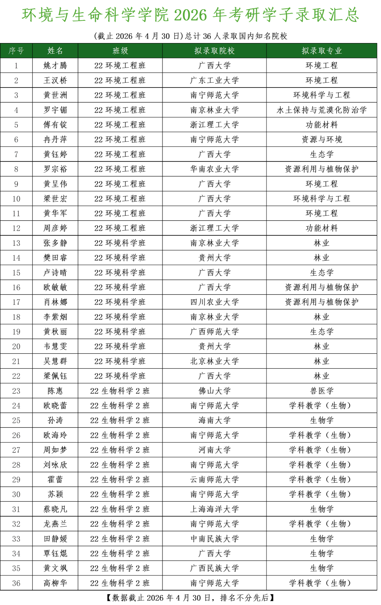 2026届毕业生考研深造工作圆满落幕。本届毕业生考研再创佳绩,共有36名学子顺利上岸、圆梦研途,考研录取率达29.03%,在录取人数、录取率及升学院校层次上实现多重突破,交出了一份亮眼的升学答卷。值得一提的是,超五成拟录取考生成功考入北京林业大学、华南农业大学、南京林业大学、广西大学等“双一流”建设高校,专业方向覆盖环境科学与工程、生物学、生态学、学科教学(生物)等领域,彰显学院学科建设的扎实底蕴。